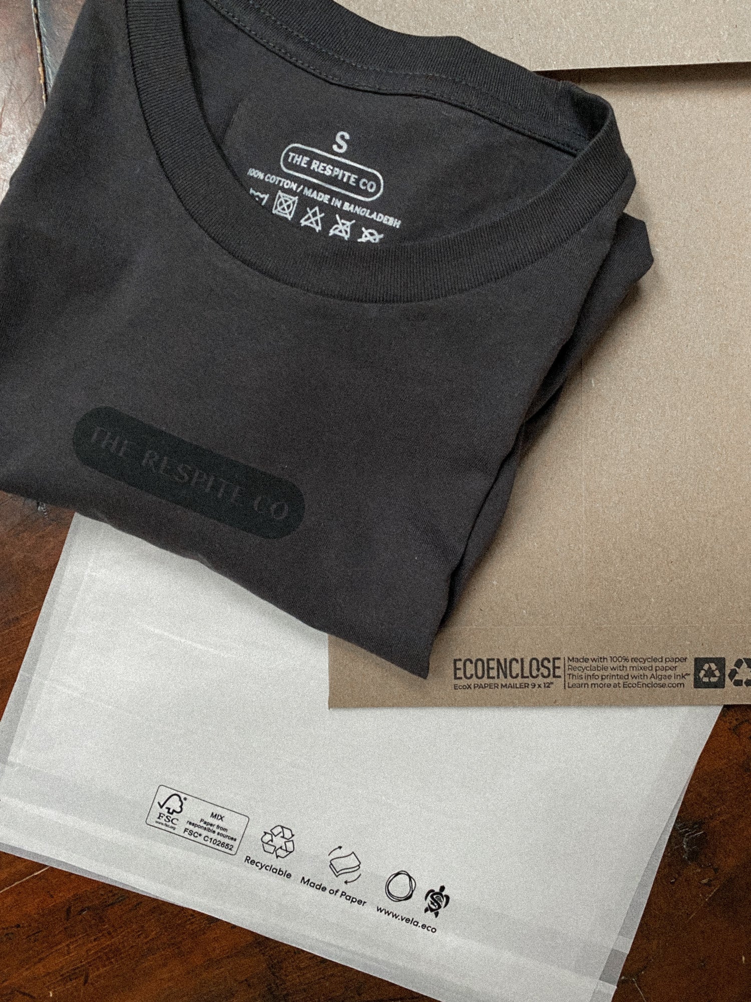 Respite Apparel's clothing is screen-printed locally in Nashville with water-based ink. Each order is packaged in eco-friendly materials from EcoEnclose: water-resistant glassine bags (made of paper) and durable paper mailers made with 100% recycled paper.